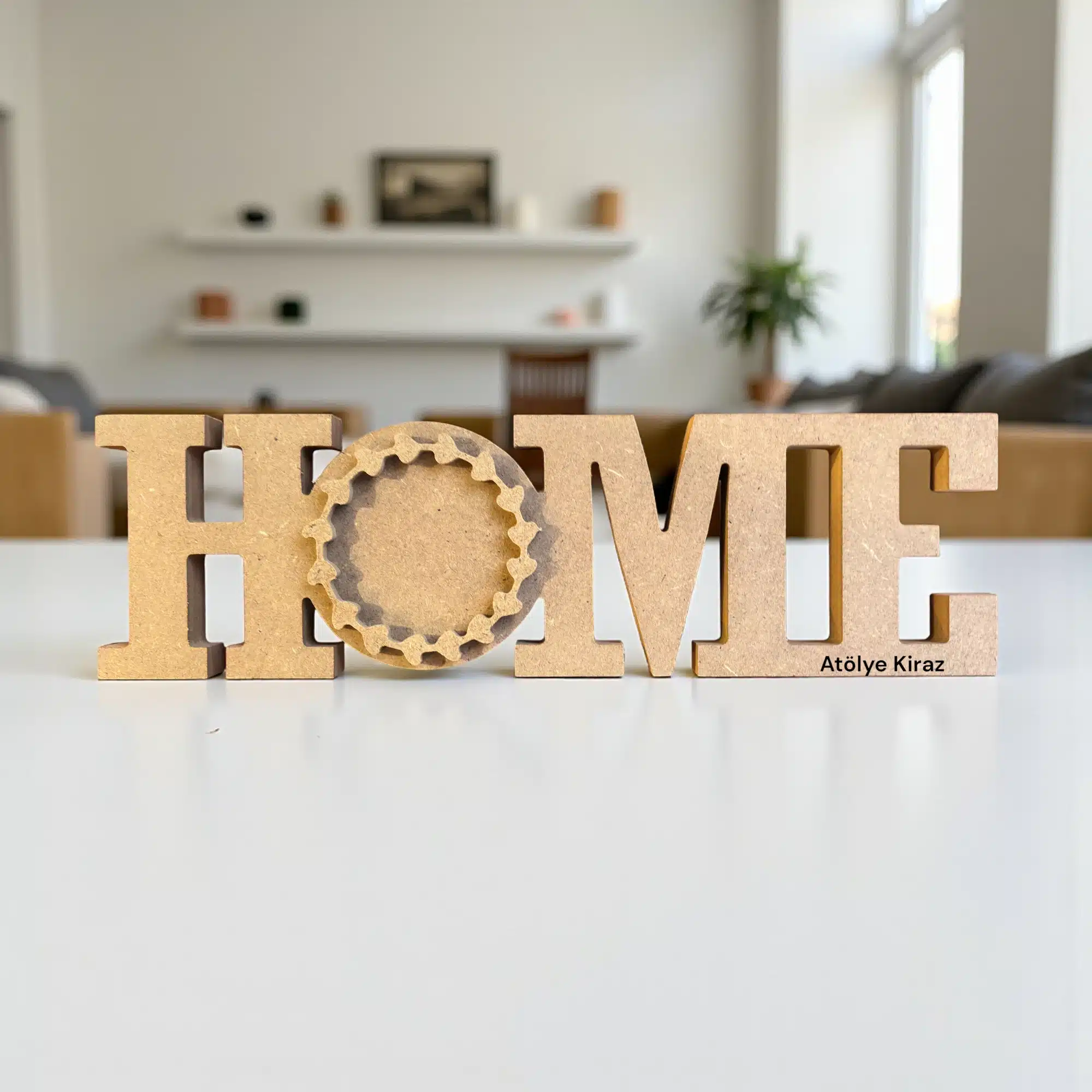 Huzurlu Karşılama: Çelenk detayıyla zenginleştirilmiş ‘Home’ temalı ahşap yazı.