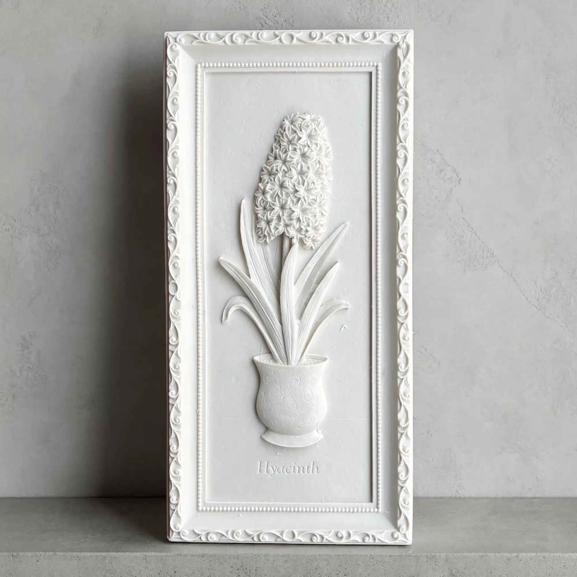 - Gösterişli ve Derinlikli Detaylar: Saksı üzerindeki ince desenler, sümbülün kendine has dolgun çiçek yapısı ve dik uzanan yaprakları üç boyutlu olarak özenle işlenmiştir. Duvarınızda güçlü bir perspektif yaratır.