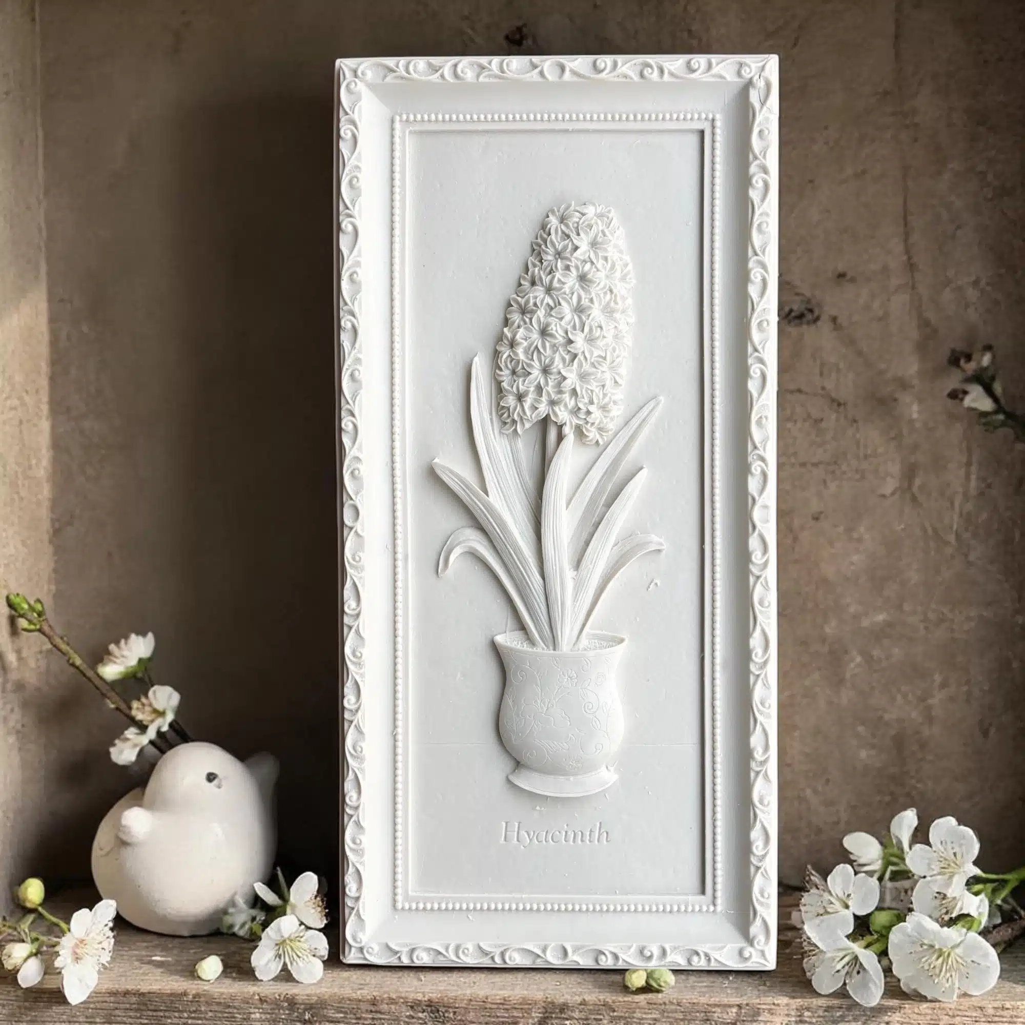 Zarif, desenli bir saksı içinden tüm ihtişamıyla yükselen sümbül (Hyacinth) figürü ve kendinden desenli şık çerçevesiyle öne çıkan bu çerçeveli saksılı sümbül panosu, dekorasyonunuza botanik bir derinlik katıyor. Atölye Kiraz’ın birinci sınıf döküm kalitesiyle üretilen bu gösterişli ham kalıp, kendi boyama tekniklerinizle adeta canlanmayı bekliyor.