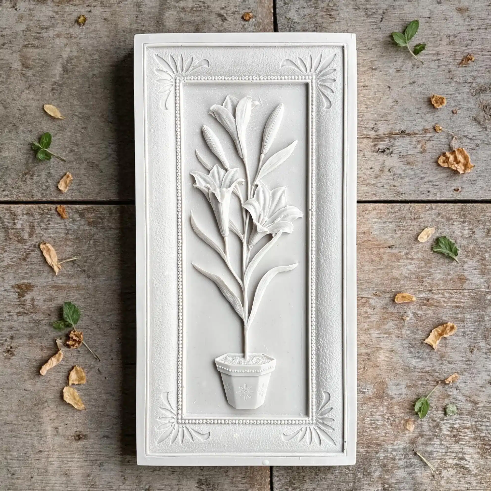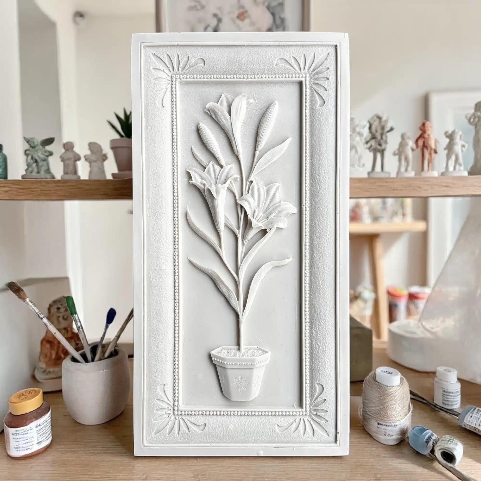 - Derinlikli Çiçek Detayları: Saksı dokusu, yaprak kıvrımları ve zambakların tomurcukları üç boyutlu olarak özenle işlenmiştir, duvarınızda güçlü bir perspektif yaratır.