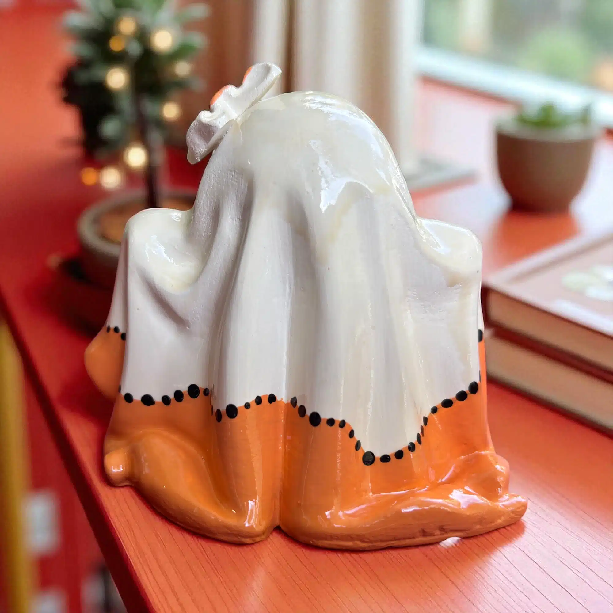 Cadılar Bayramı’nın neşeli ve gizemli ruhunu evinize taşımaya hazır mısınız? **Dekoratif Hayalet Figürü**, el boyaması özel tasarımıyla sonbahar ve **Halloween** temalı dekorasyonlarınızın en sevimli ve dikkat çekici parçası olacak. İster tek başına sergileyin, ister diğer Cadılar Bayramı aksesuarlarıyla birlikte kullanarak tam bir konsept oluşturun, bu figür her mekanda gülümseme yaratacak.