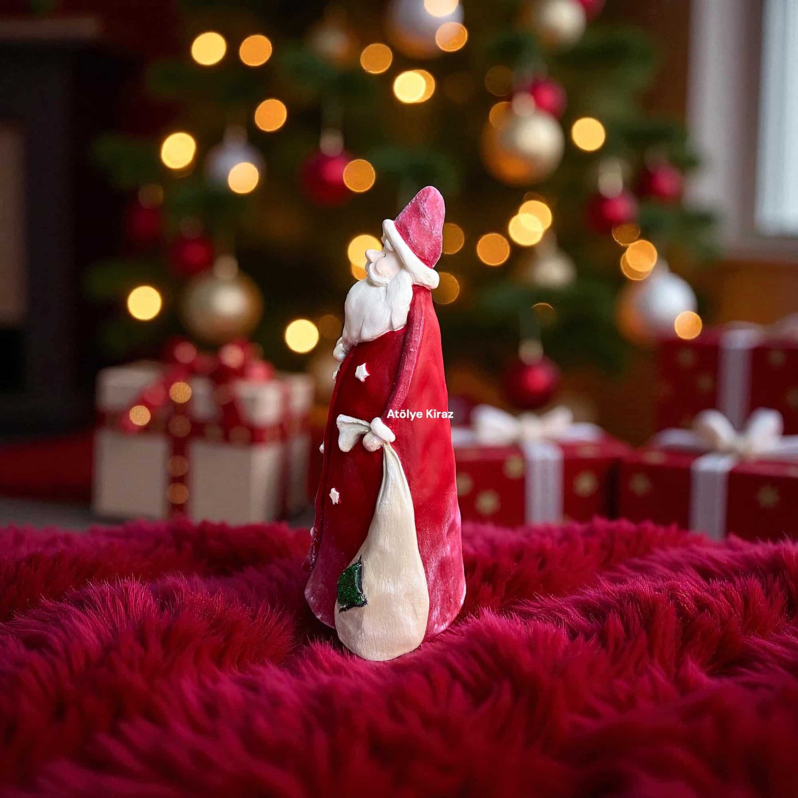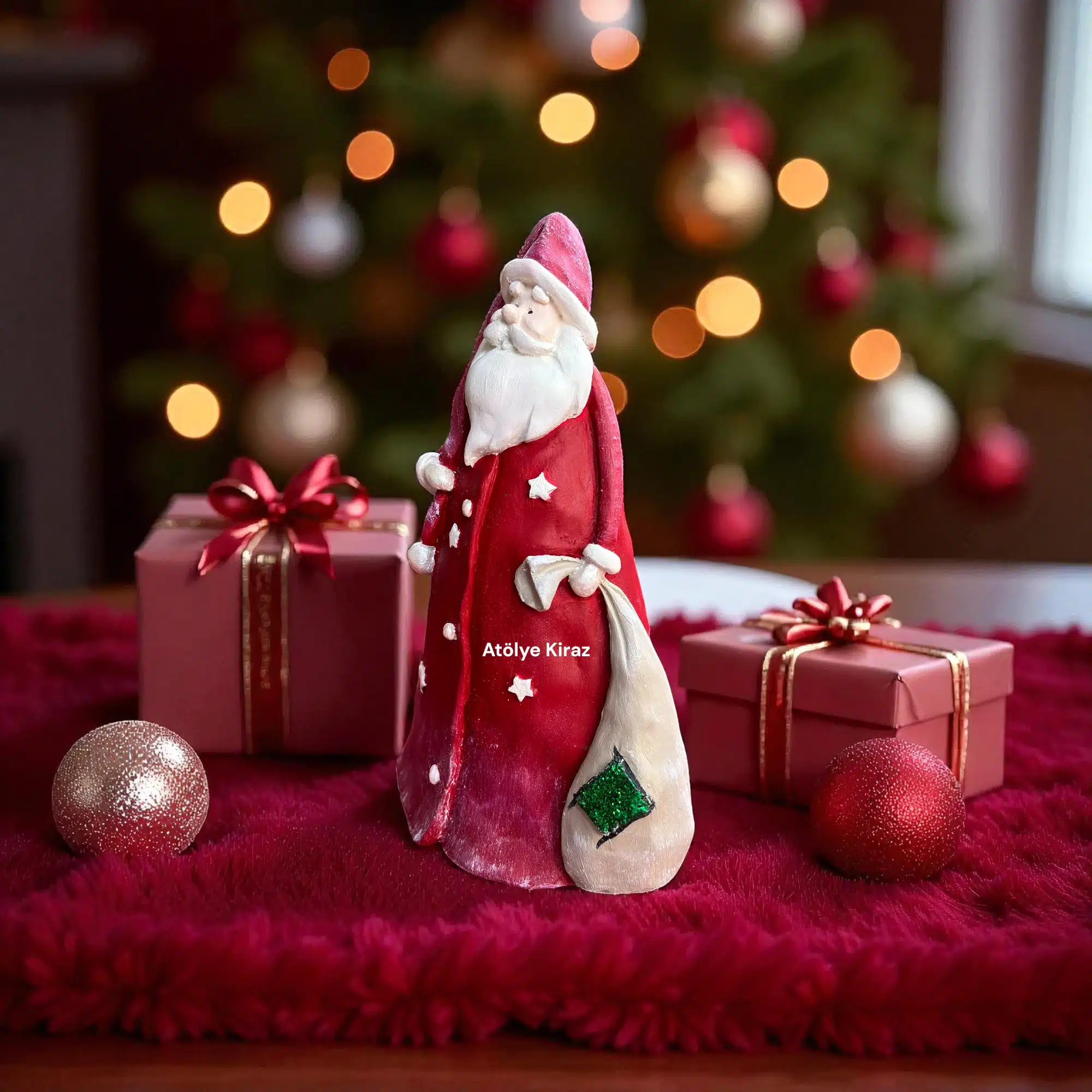 Yılbaşı coşkusunu ve kış mevsiminin büyülü atmosferini evinize taşımak için tasarlanmış bu el boyaması heykel ile tanışın. Dekoreli Polyester Uzun Noel Baba Heykeli, kalın, uzun dış giysisi, sırtında taşıdığı hediye çuvalı ve beyaz sakallarıyla geleneksel Noel Baba temasını yansıtır. Bu detaylı heykel, Atölye Kiraz ustaları tarafından özenle boyanmış olup, canlı kırmızı rengi ve üzerindeki yıldız detaylarıyla Yılbaşı dekorasyonunuzun odak noktası olacaktır.