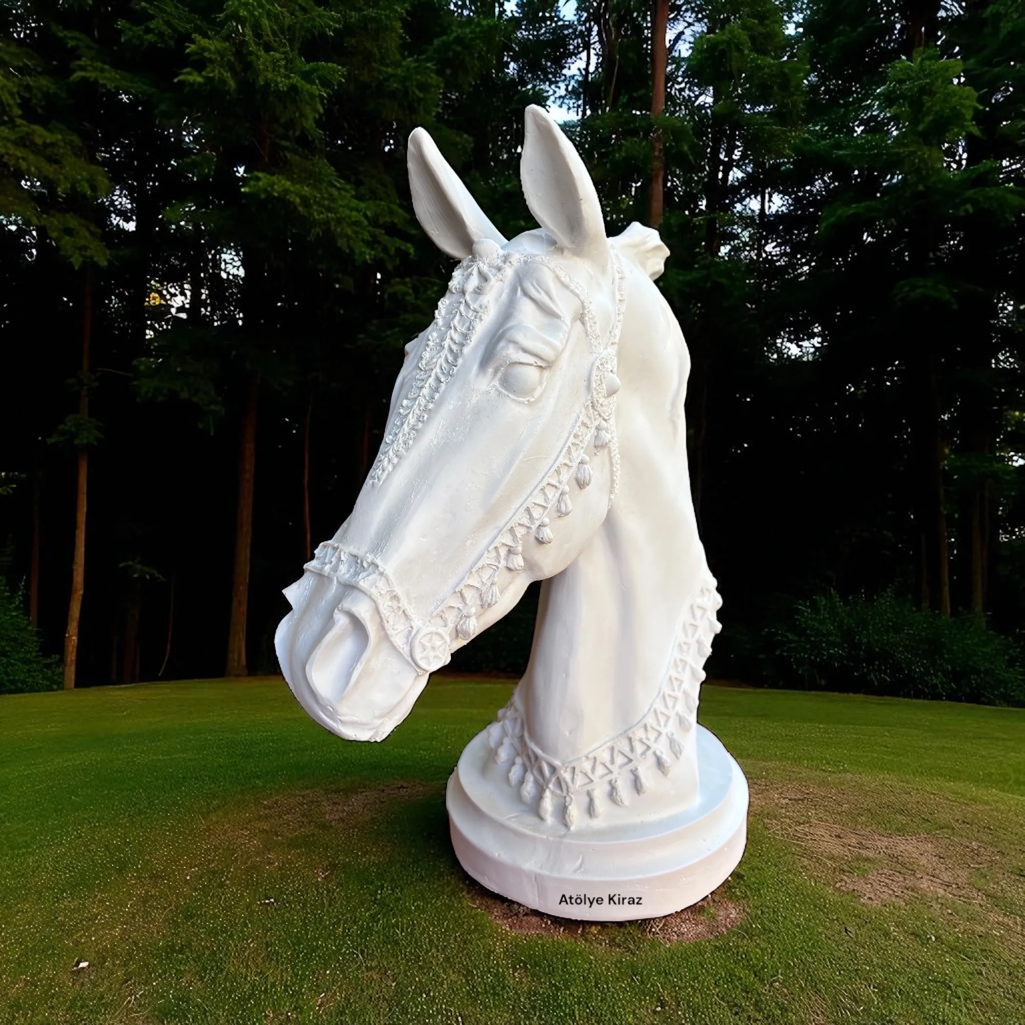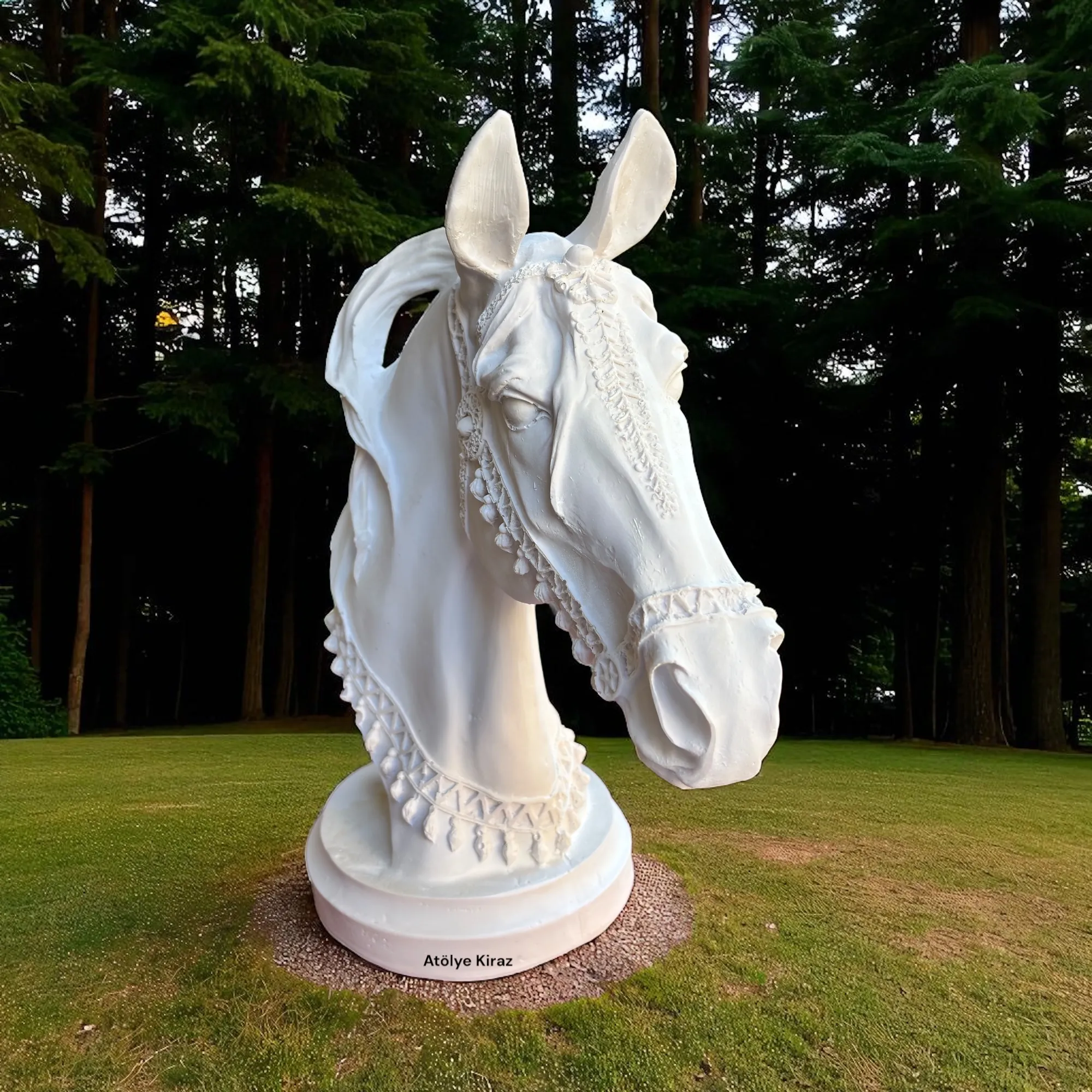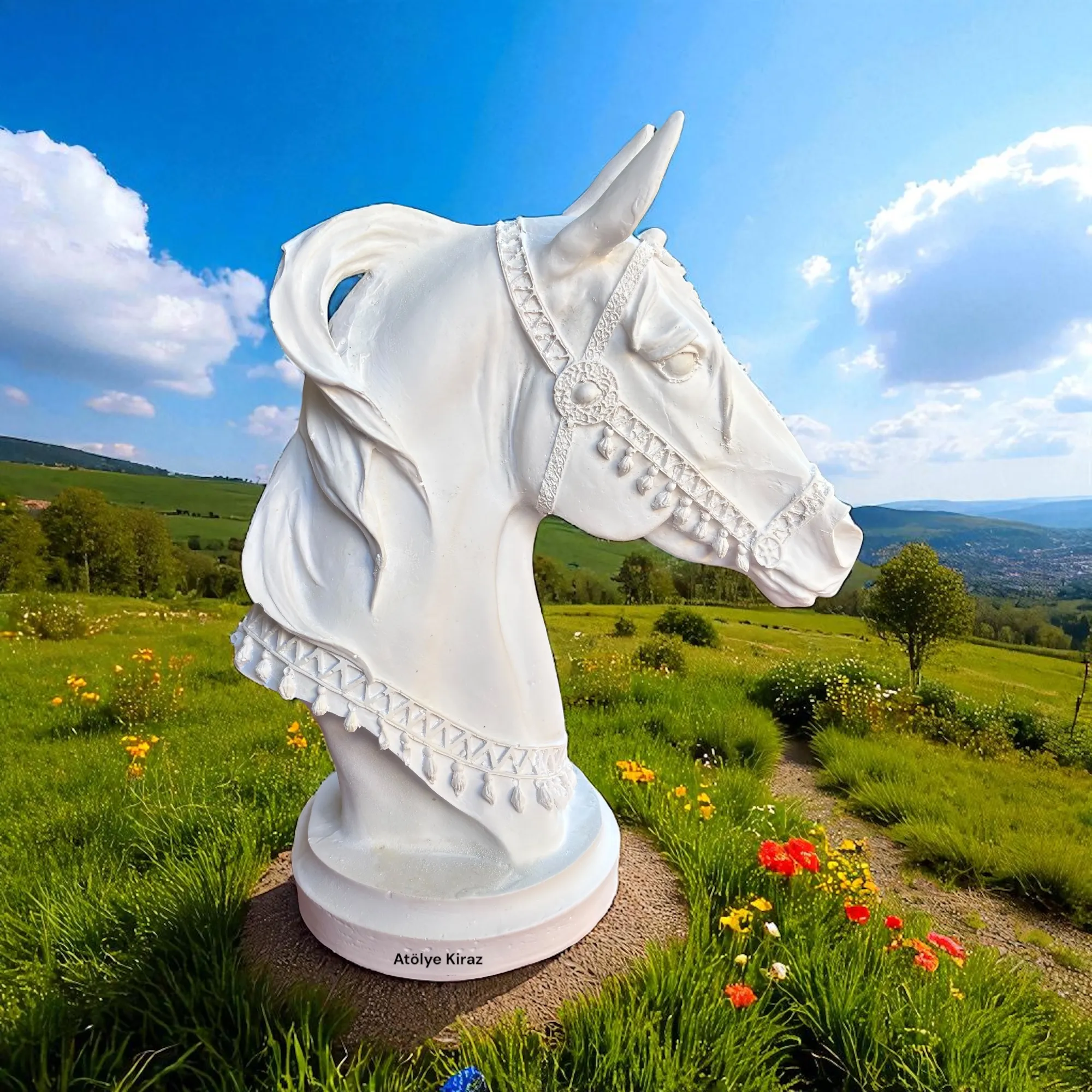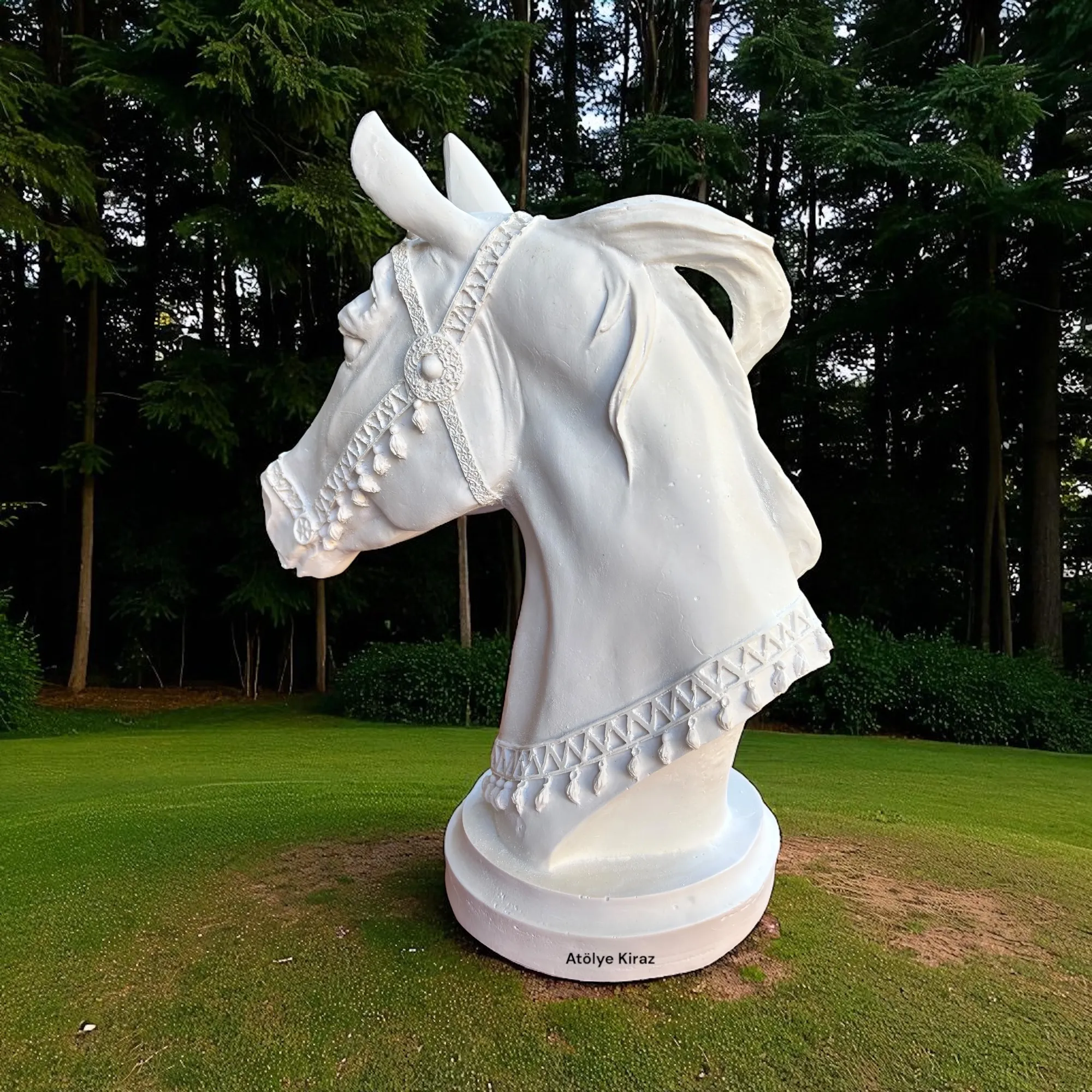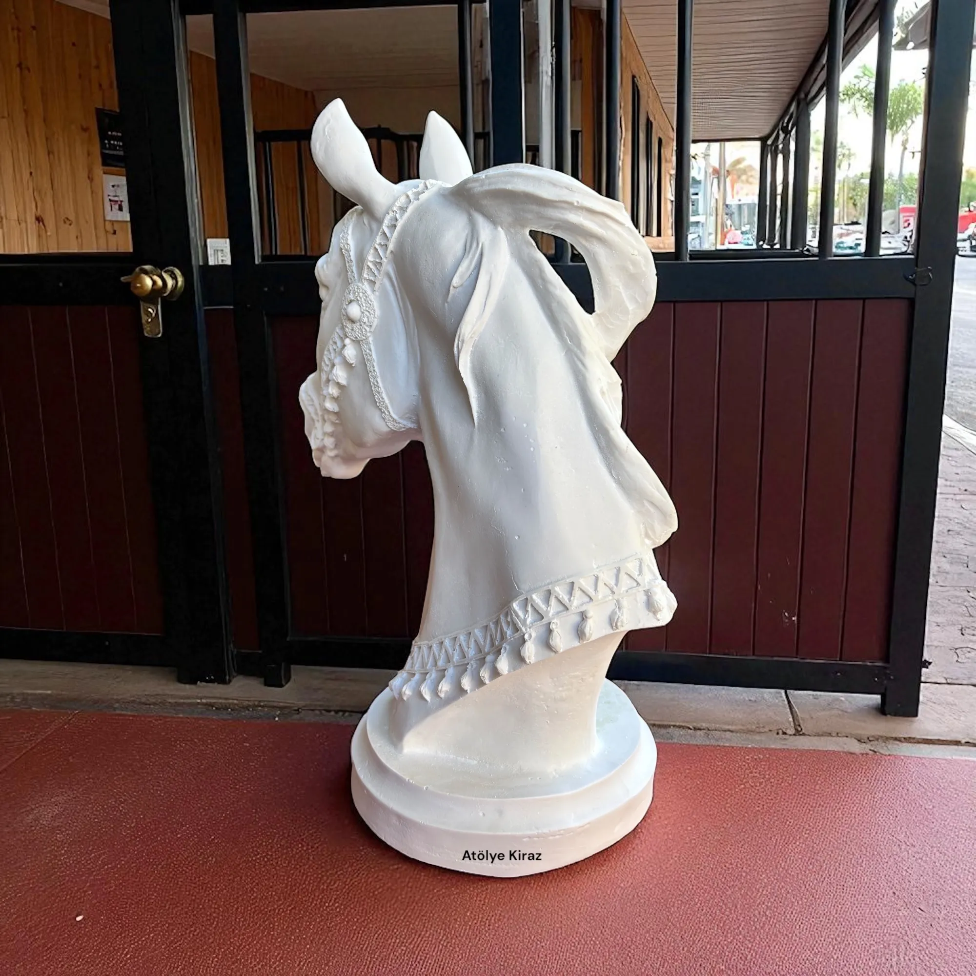 Heykelin her bir ayrıntısı, gerçek bir atın anatomisine ve duruşuna sadık kalınarak tasarlanmıştır. Gözlerindeki derin ifade, yelesindeki dalgalı form ve başındaki süslemeler, heykeli sadece bir büstten çok daha fazlası yapar. Bu polyester büst heykeli, sanatsal bir esere dönüşmeye hazır bekliyor.