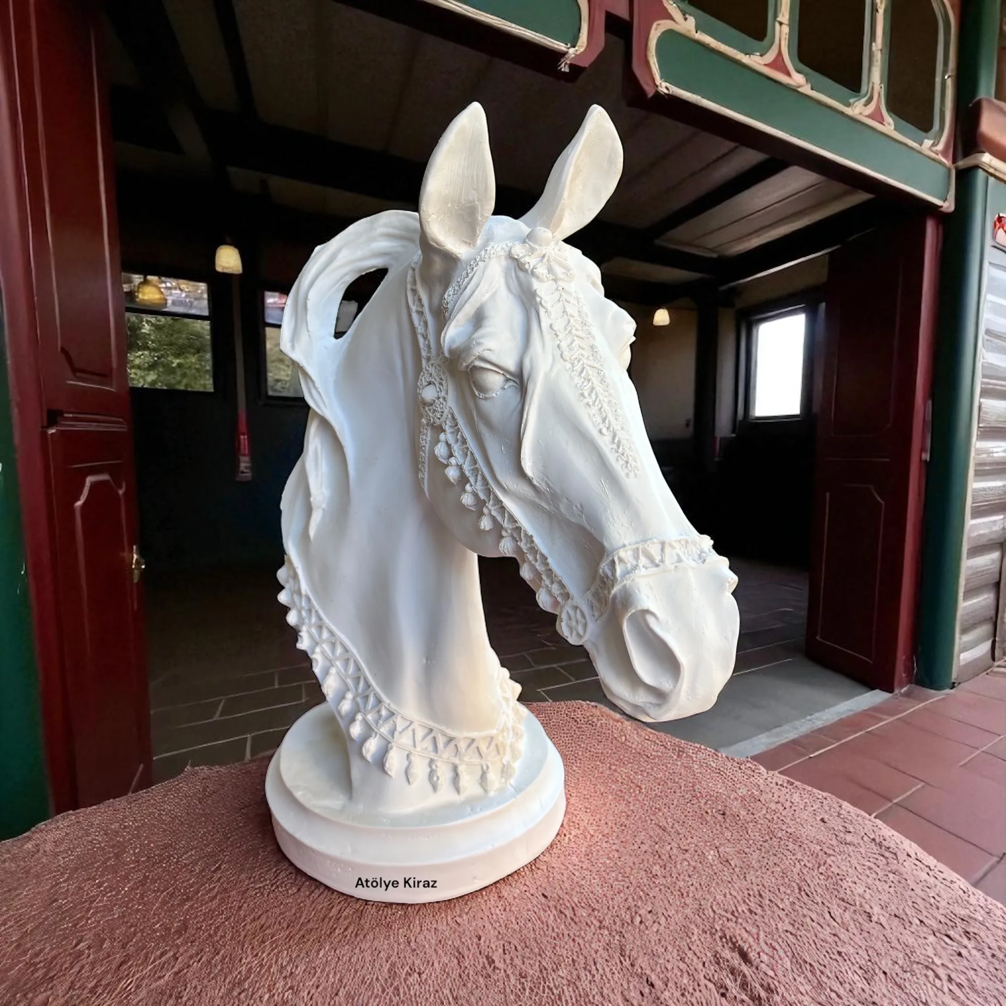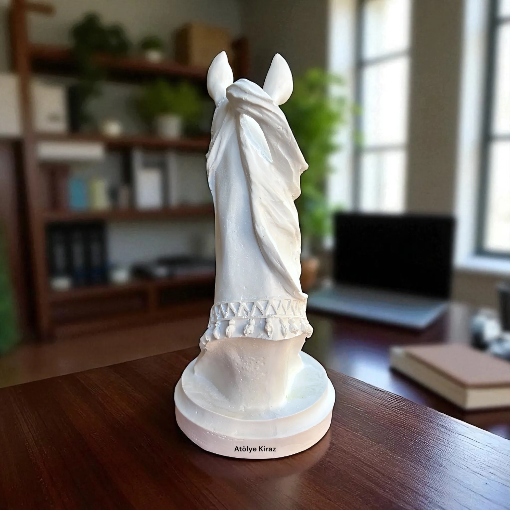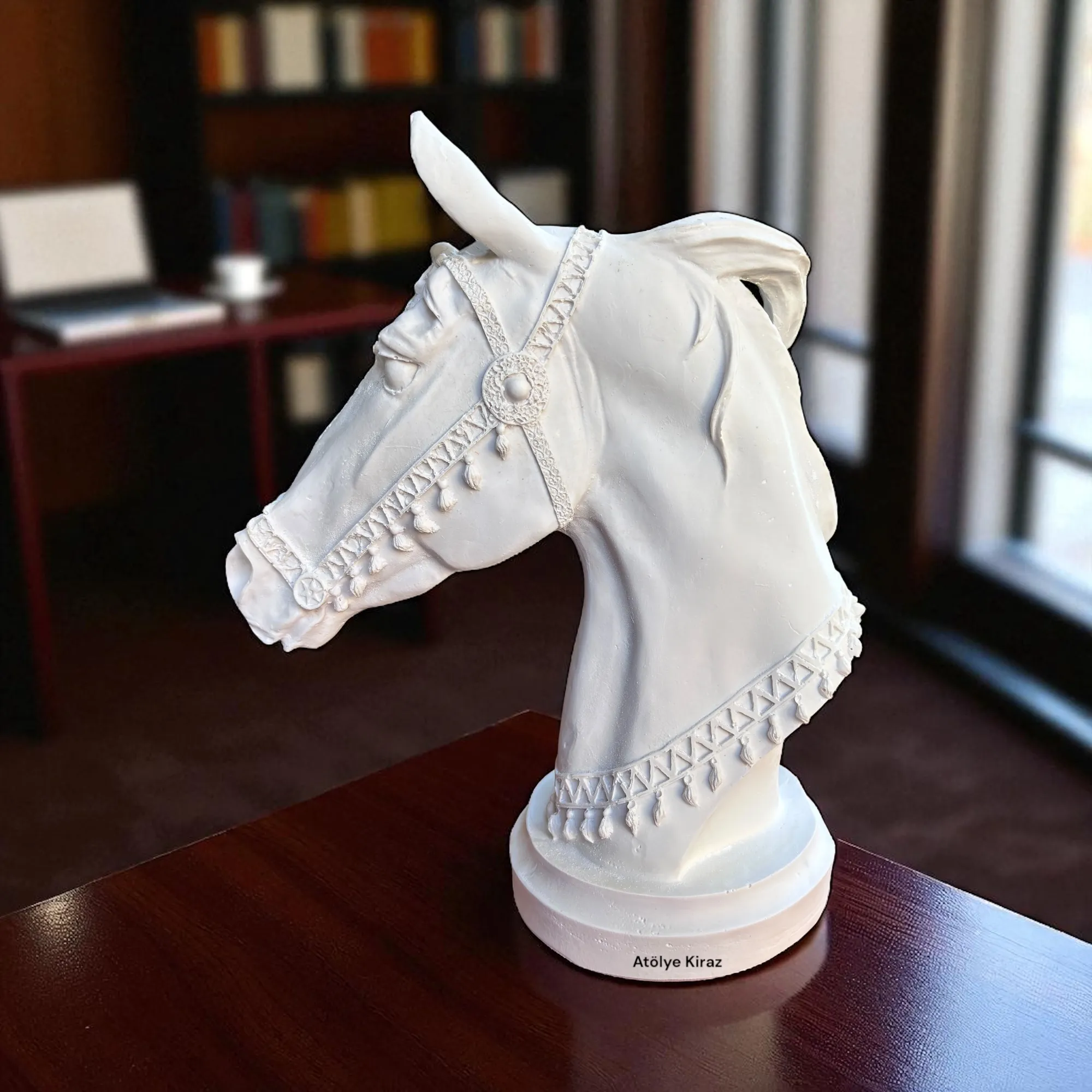 Salonunuzda, çalışma odanızda veya kitaplığınızda at büstü ile güçlü bir odak noktası oluşturabilirsiniz. Heykelin zarif ve minimal formu, modern, klasik ya da bohem gibi farklı dekorasyon stillerine kolayca uyum sağlar. Bu at kafası büstü, mekanınıza derinlik ve karakter katar.