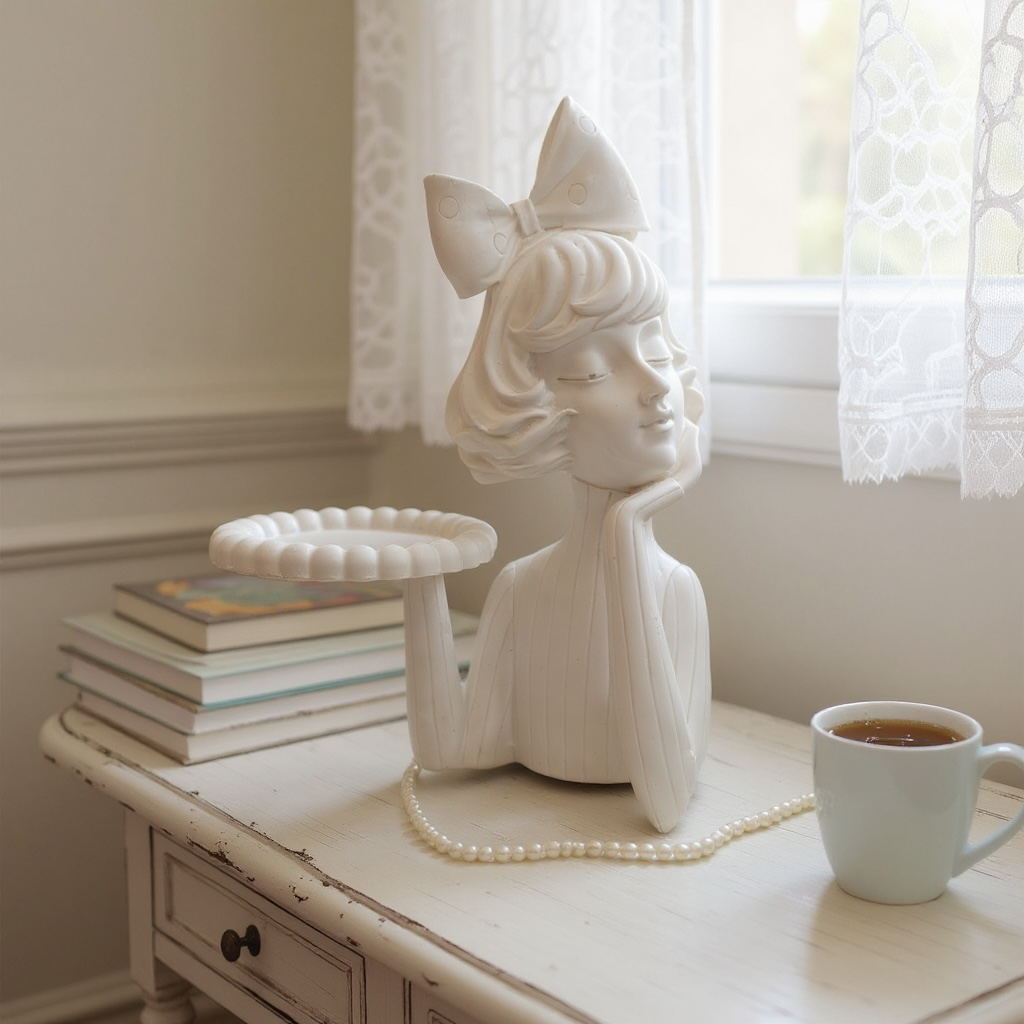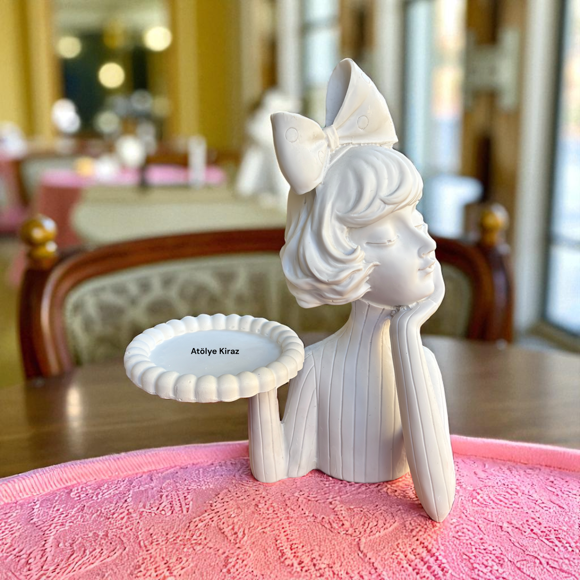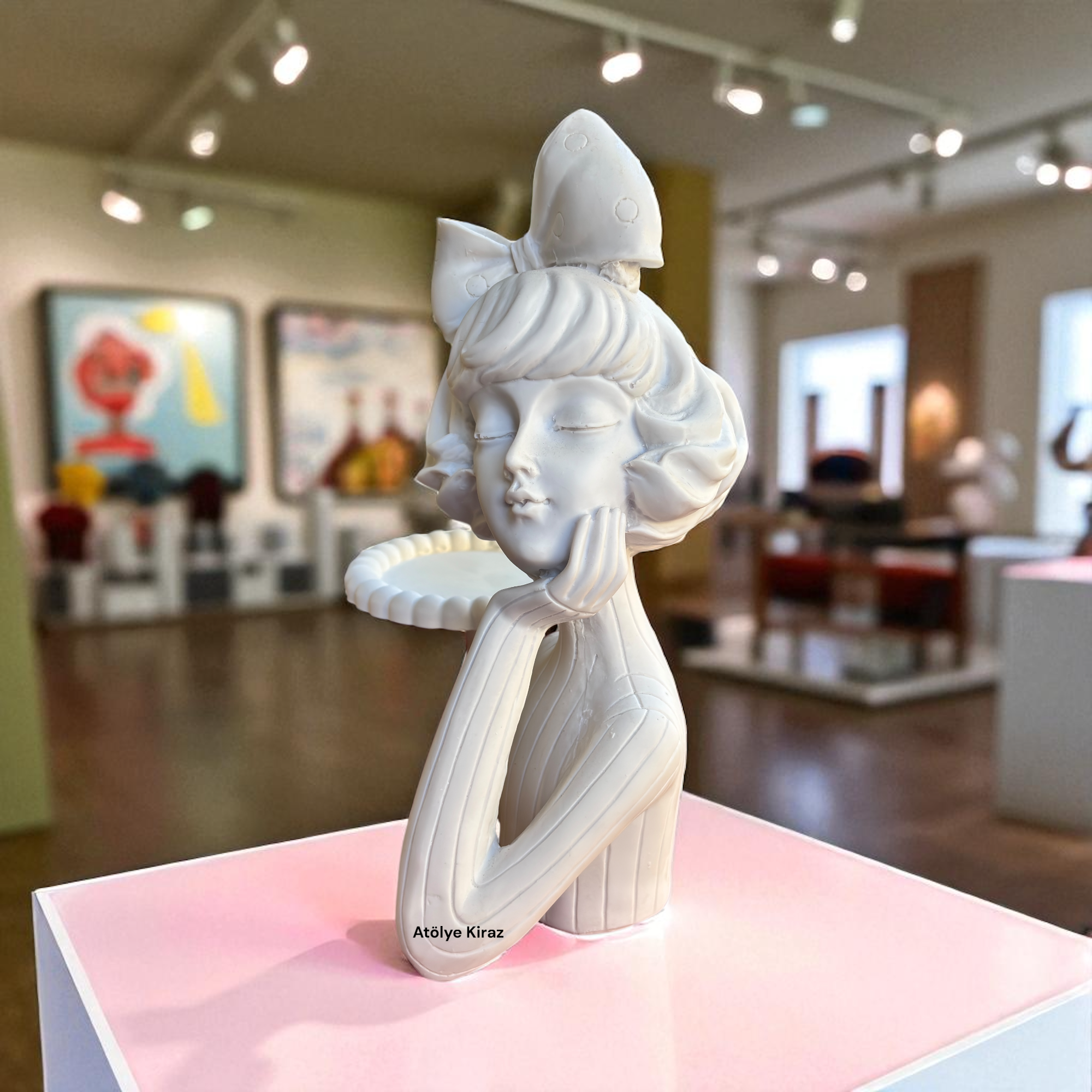 Mutfaklarınıza, yemek odalarınıza veya kafenize hem sanatsal hem de pratik bir dokunuş katmaya hazır mısınız? Bu **Ham Polyester Garson Kız Biblo**, elindeki zarif tepsiyle misafirlerinizi güler yüzle karşılayan sevimli bir garson kızı tasvir ediyor. Saçındaki büyük fiyonk detayı ve düşünceli duruşuyla, her ortama sıcak ve davetkar bir hava katıyor. Ürünün ham yapısı sayesinde, hayal gücünüzle onu dilediğiniz renge boyayabilir, mekanınızın ruhuna uygun eşsiz bir eser yaratabilirsiniz.