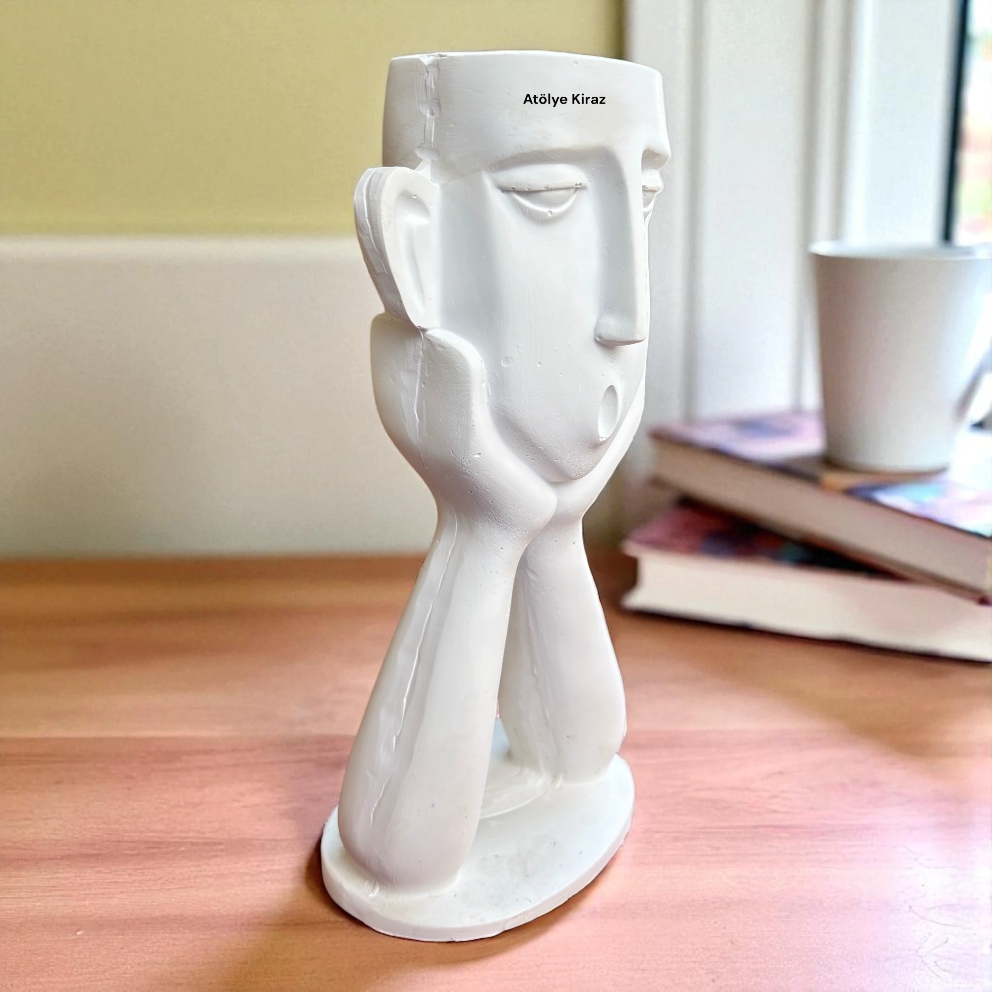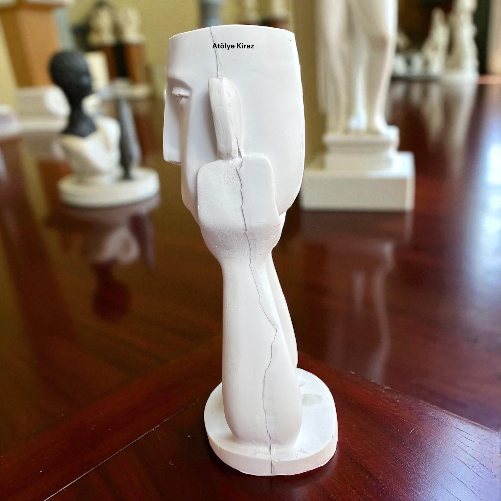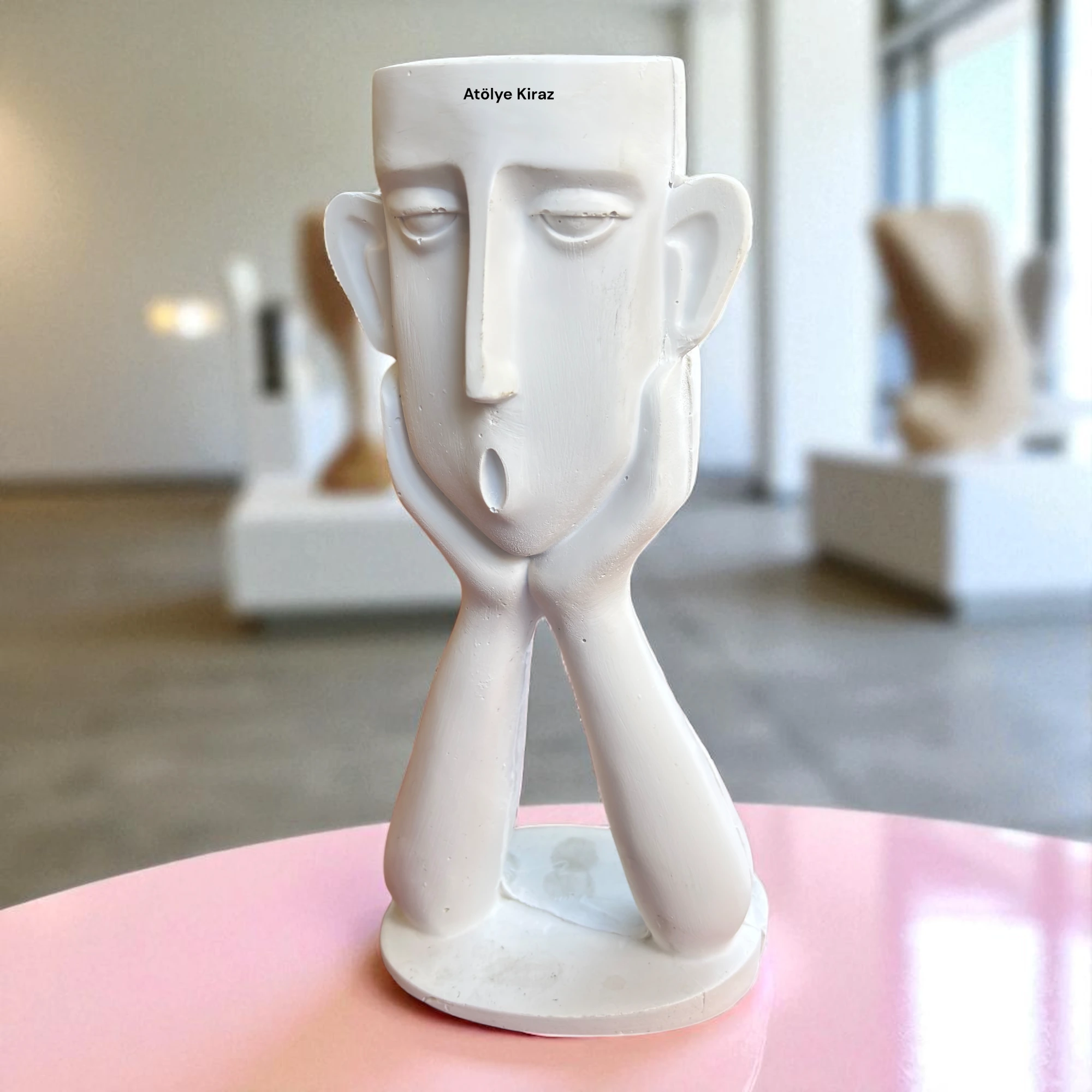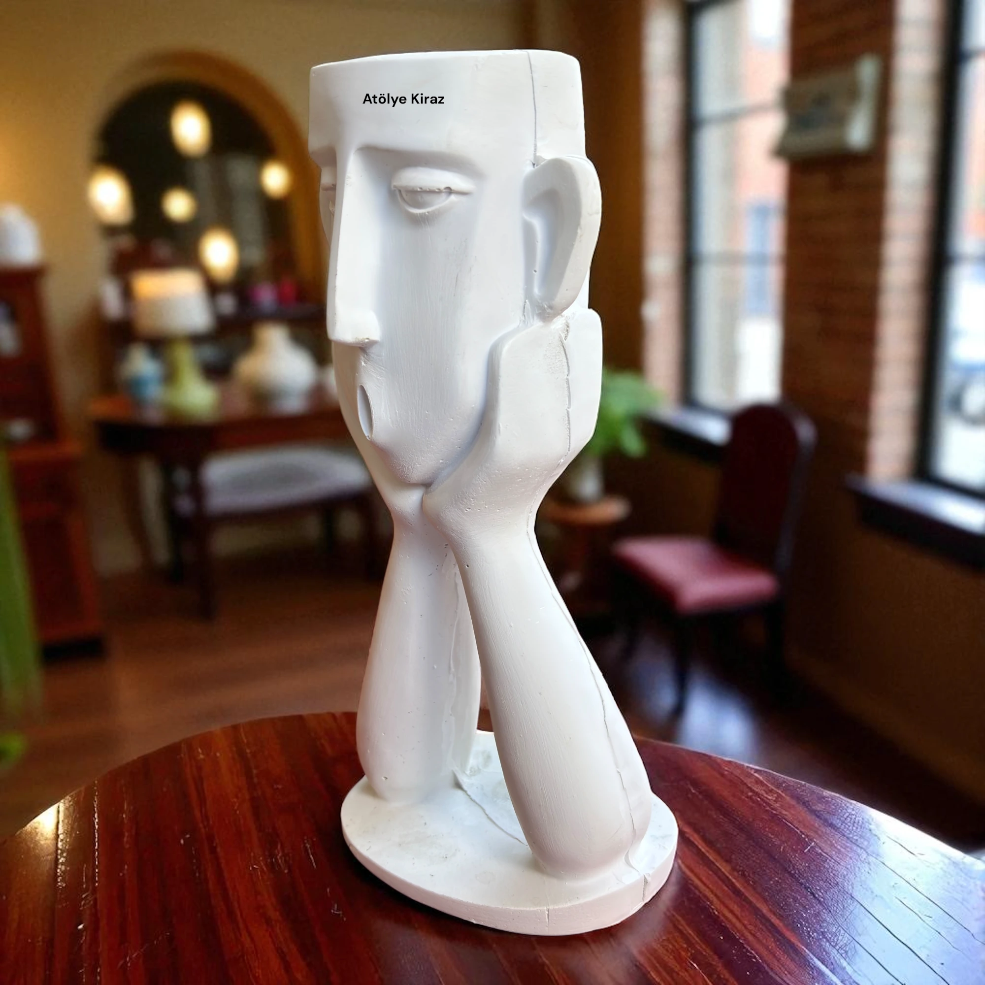 Dekorasyonunuzda Modern Sanatın gücünü ve estetik zenginliğini yansıtmak ister misiniz? **Ham Polyester Soyut Vazo**, düşünen bir figürün başını elleriyle tuttuğu soyut tasarımıyla, bakışları üzerine çeken dramatik bir **sanat objesi**dir. Ürünün benzersiz formu, sadece bir **vazo** olmaktan öte, sergilendiği her yerde bir **heykel** etkisi yaratır. Ham ve boyanmamış olması, size kendi renk paletinizi belirleme ve bu soyut figürü tamamen kişisel bir şahesere dönüştürme fırsatı sunar.