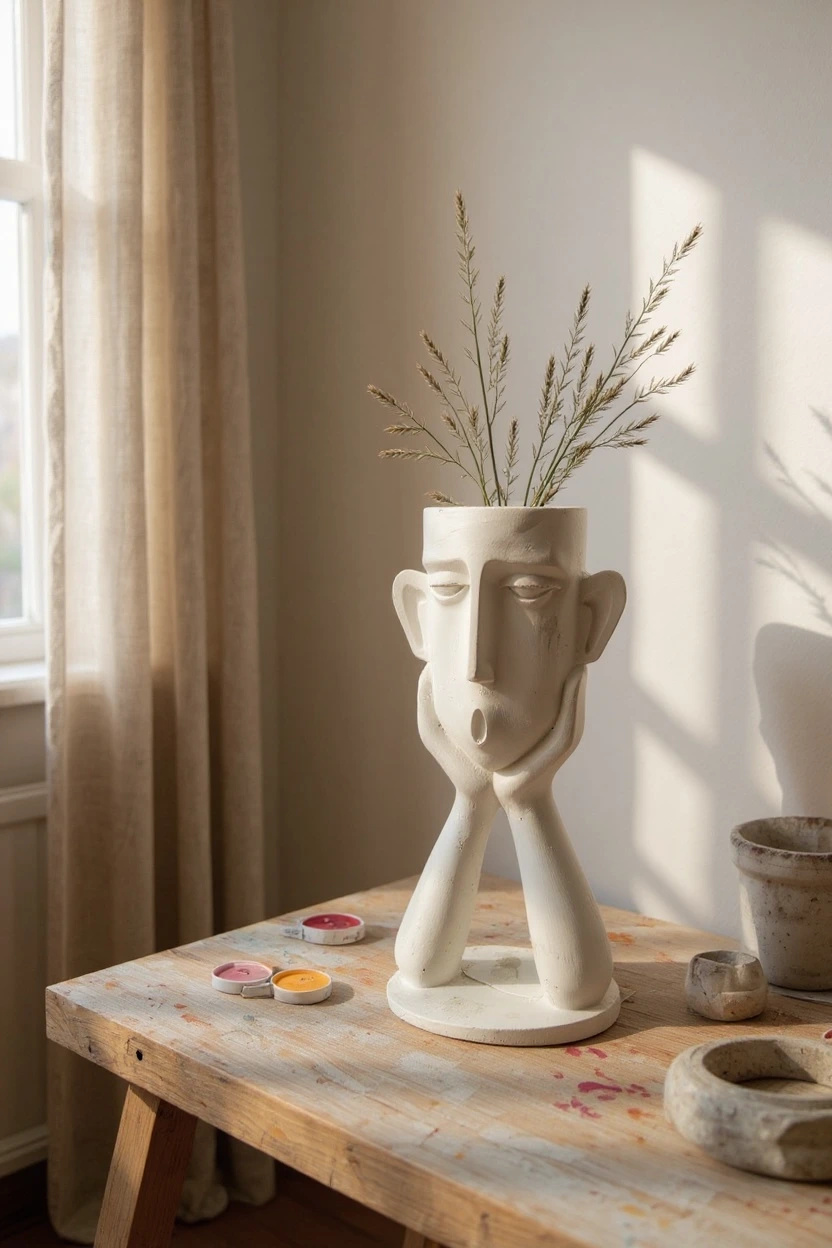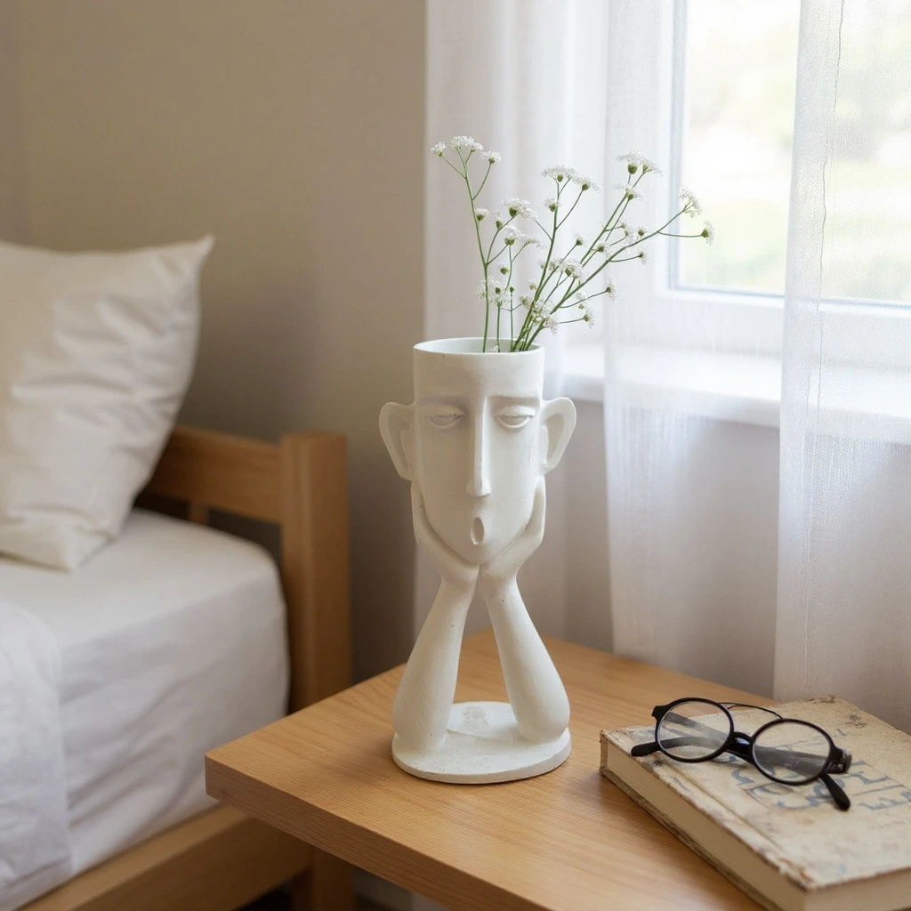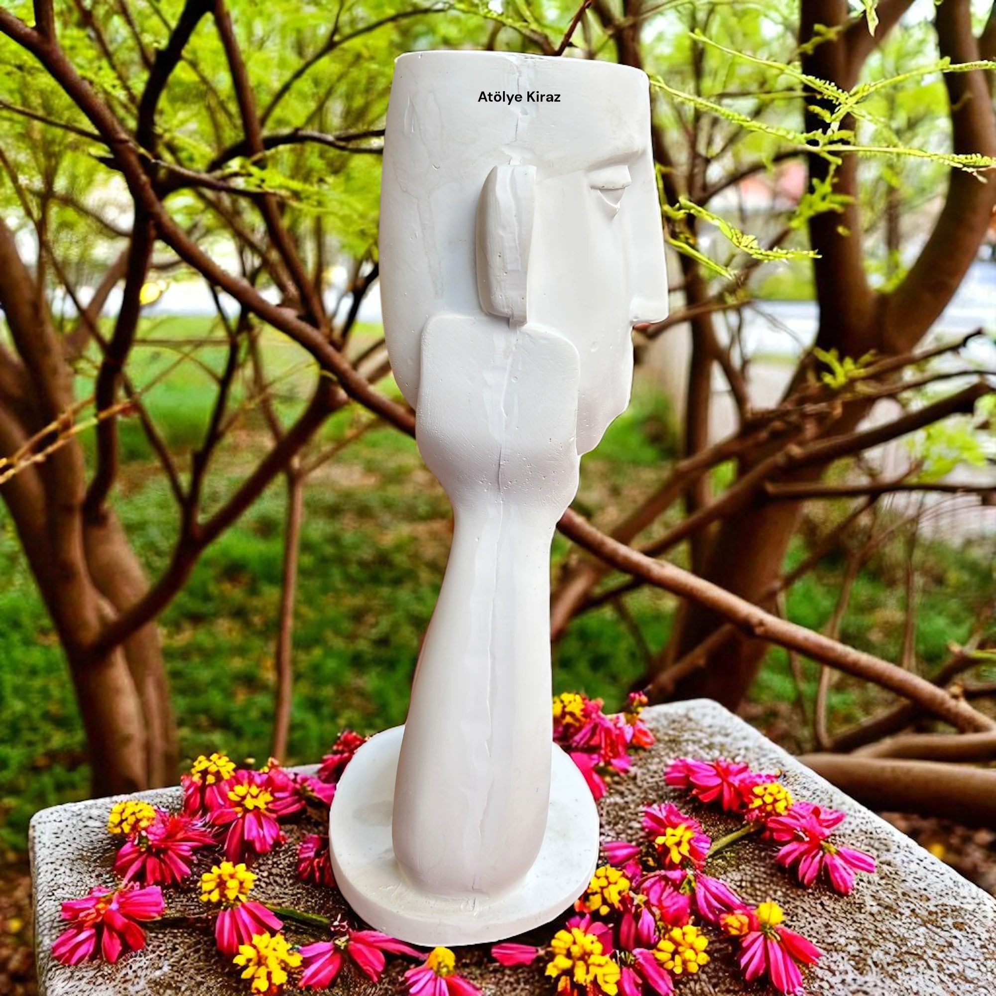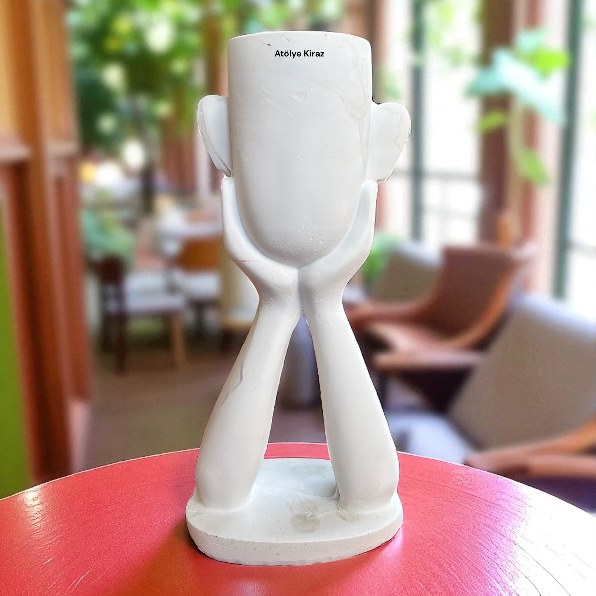 Dekorasyonunuzda Modern Sanatın gücünü ve estetik zenginliğini yansıtmak ister misiniz? **Ham Polyester Soyut Vazo**, düşünen bir figürün başını elleriyle tuttuğu soyut tasarımıyla, bakışları üzerine çeken dramatik bir **sanat objesi**dir. Ürünün benzersiz formu, sadece bir **vazo** olmaktan öte, sergilendiği her yerde bir **heykel** etkisi yaratır. Ham ve boyanmamış olması, size kendi renk paletinizi belirleme ve bu soyut figürü tamamen kişisel bir şahesere dönüştürme fırsatı sunar.