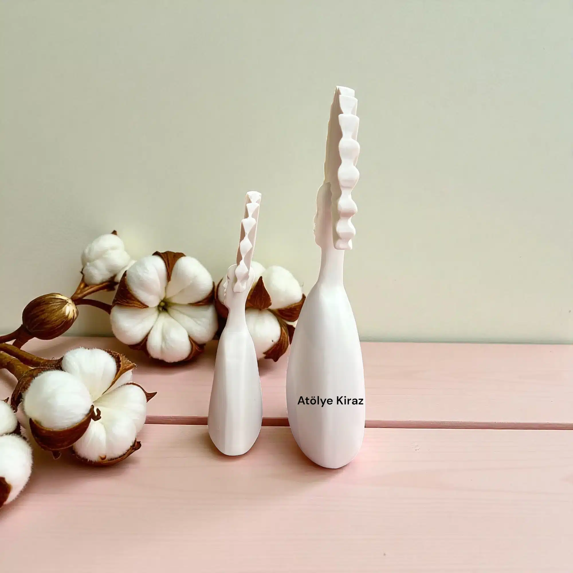 Hikaye ve Sembolizm: Bu soyut figür, kadın formunun inceliğini ve zarafetini vurgularken, yelpaze şeklindeki saç detayıyla hareketli bir taç imajı oluşturur. Figürün sade gövdesi ve belirgin baş tasarımı, modern ve Art Deco akımlarının stilistik özgünlüğünü temsil eder. Ham haliyle sade bir şıklık sunarken, metalik, neon veya mermer efektli boyalarla boyanarak bambaşka bir enerjiye bürünebilir.