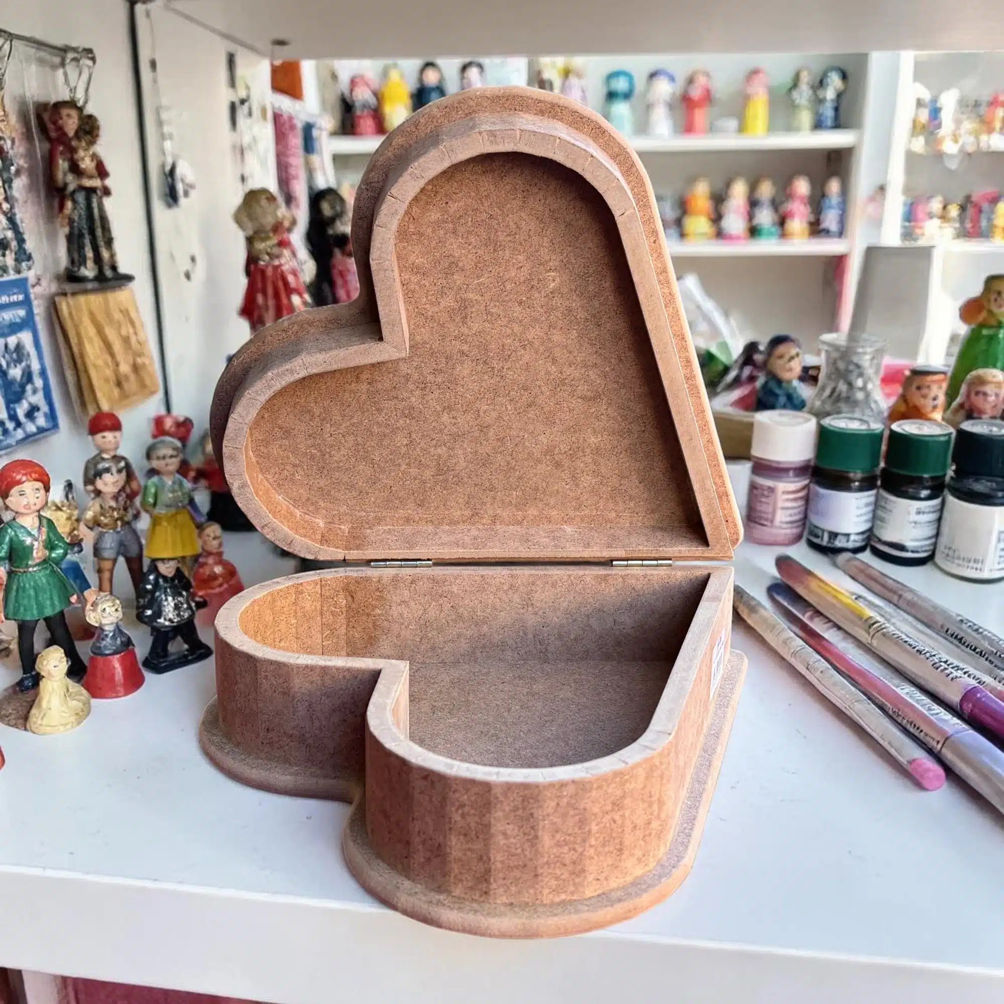 Kendi el emeğinizle unutulmaz bir hediye hazırlamak veya en özel anılarınızı şık bir şekilde muhafaza etmek istiyorsanız, bu menteşeli kalp kutu tam size göre. Zarif hatları ve geniş iç hacmiyle öne çıkan bu obje, Atölye Kiraz’ın pürüzsüz yüzey kalitesiyle sizin fırçanızdan çıkacak renklerle hayat bulmayı bekliyor.