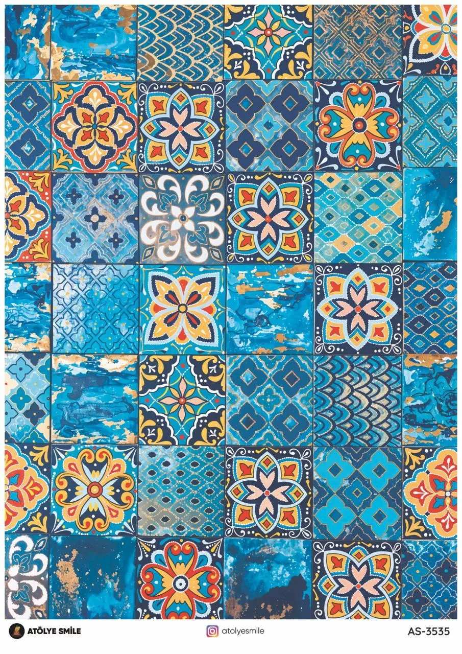 PD3535-AS | Pirinç Dekopaj Kağıdı (29×42 cm) | Mavi Ağırlıklı Kare Kare Farklı Farklı Motif Temalı
