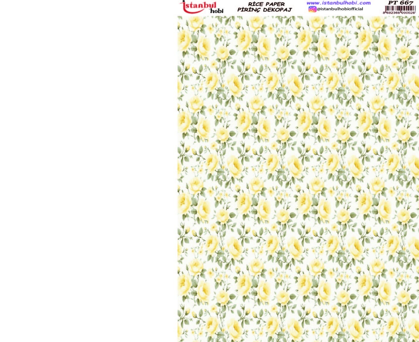 Pirinç Dekopaj Kağıdı, el sanatları tutkunları ve DIY (Kendin Yap) projeleri için mükemmel bir tercihtir. Yüksek kaliteli ve dayanıklı bu özel kağıt, yüzeylere kolayca yapışarak size mükemmel sonuçlar sunar. Ahşap, cam, seramik, metal ve kumaş gibi birçok yüzeyde kullanabileceğiniz Pirinç Dekopaj Kağıdı ile özgün ve zarif tasarımlar yaratabilirsiniz. Pirinç Dekopaj Kağıdı, çeltik sapından yapılan ince kâğıt üzerine basılı olup, pirinç dekopaj çalışmaları için kullanılmaktadır. Dekopaj tutkalı ile istediğiniz alana kolayca yapıştırıp üzerine boyama, rölyef, varak ve vernik uygulayabilirsiniz. Özellikler: