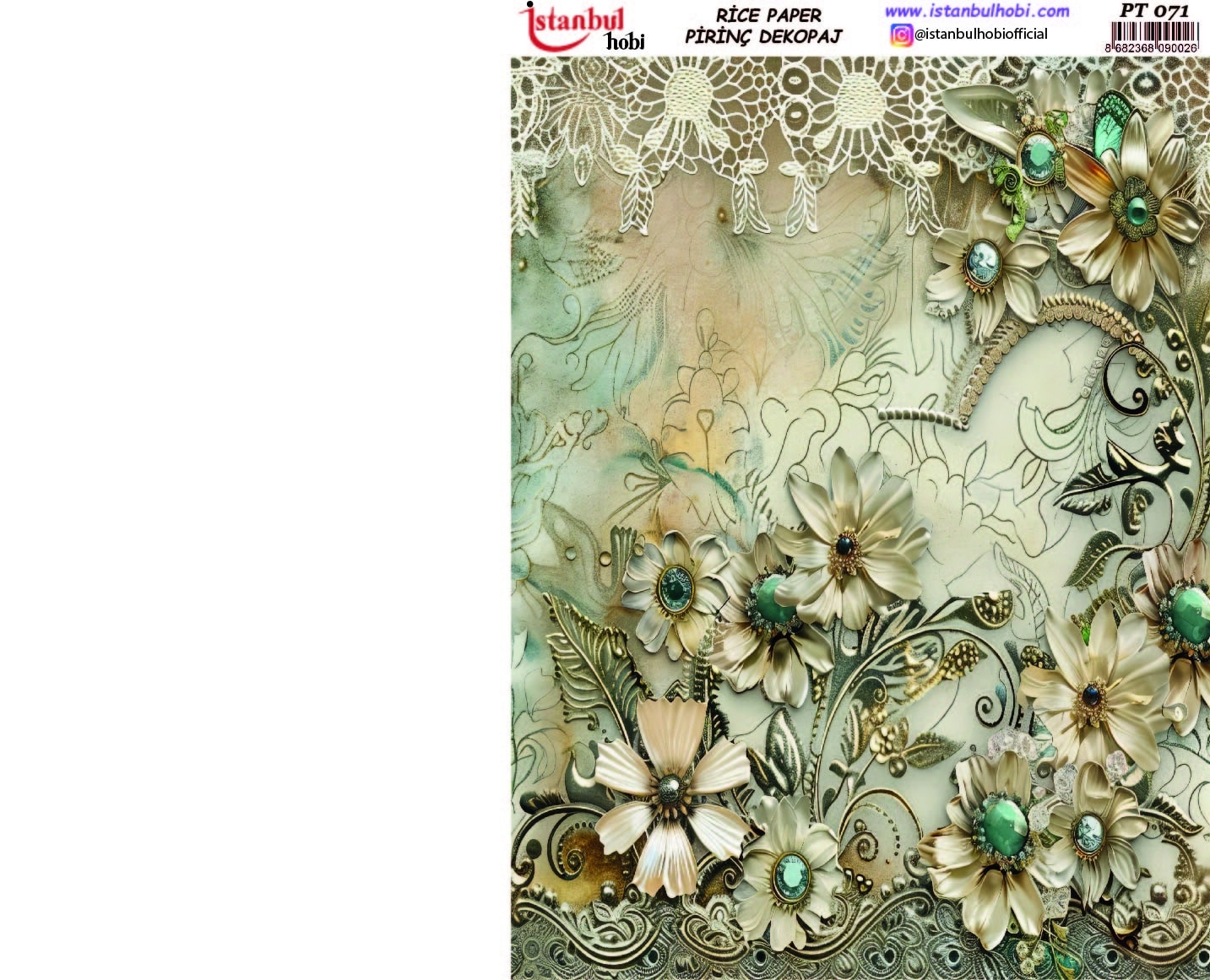 Pirinç Dekopaj Kağıdı, el sanatları tutkunları ve DIY (Kendin Yap) projeleri için mükemmel bir tercihtir. Yüksek kaliteli ve dayanıklı bu özel kağıt, yüzeylere kolayca yapışarak size mükemmel sonuçlar sunar. Ahşap, cam, seramik, metal ve kumaş gibi birçok yüzeyde kullanabileceğiniz Pirinç Dekopaj Kağıdı ile özgün ve zarif tasarımlar yaratabilirsiniz. Pirinç Dekopaj Kağıdı, çeltik sapından yapılan ince kâğıt üzerine basılı olup, pirinç dekopaj çalışmaları için kullanılmaktadır. Dekopaj tutkalı ile istediğiniz alana kolayca yapıştırıp üzerine boyama, rölyef, varak ve vernik uygulayabilirsiniz. Özellikler: