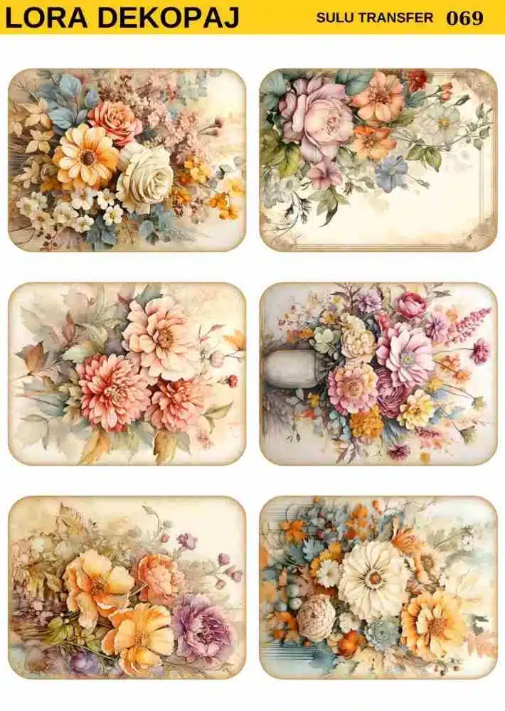 Sulu transfer kağıtları, bilinen en pratik ve etkileyici dekorasyon tekniklerinden biridir. Bu yöntemde, özel olarak basılmış desen, su yardımıyla kağıttan ayrılarak istediğiniz yüzeye kolayca yapışır. Sulu transfer üzerindeki her bir sulu transfer deseni, adeta bir sanat eseri titizliğiyle suluboya efekti verilerek tasarlanmıştır. Farklı boyutlardaki desen ve figürler projenize dinamik ve natürel bir görünüm kazandırır. Bu desenler, özellikle açık renkli ahşap tepsiler, beyaz seramik kaseler, cam kavanozlar veya krem rengi makyaj kutuları üzerinde harikalar yaratır. Vintage, shabby chic ve romantik tasarımları sevenler için ideal bir seçenektir.