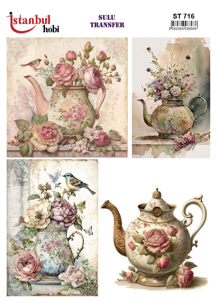 Evinizin her köşesine romantizm ve zarafet katacak, özel desen ve figürlerden oluşan sulu transfer ile tanışın. Renk tonlarındaki gerçekçi desen ve figürleri içeren bu tasarım, obje yüzeylerinizi dönüştürür. Eski mobilyalardan seramik objelere kadar pek çok yüzeyde kullanabilir, mekanlarınıza nostaljik ve şık bir hava katabilirsiniz.