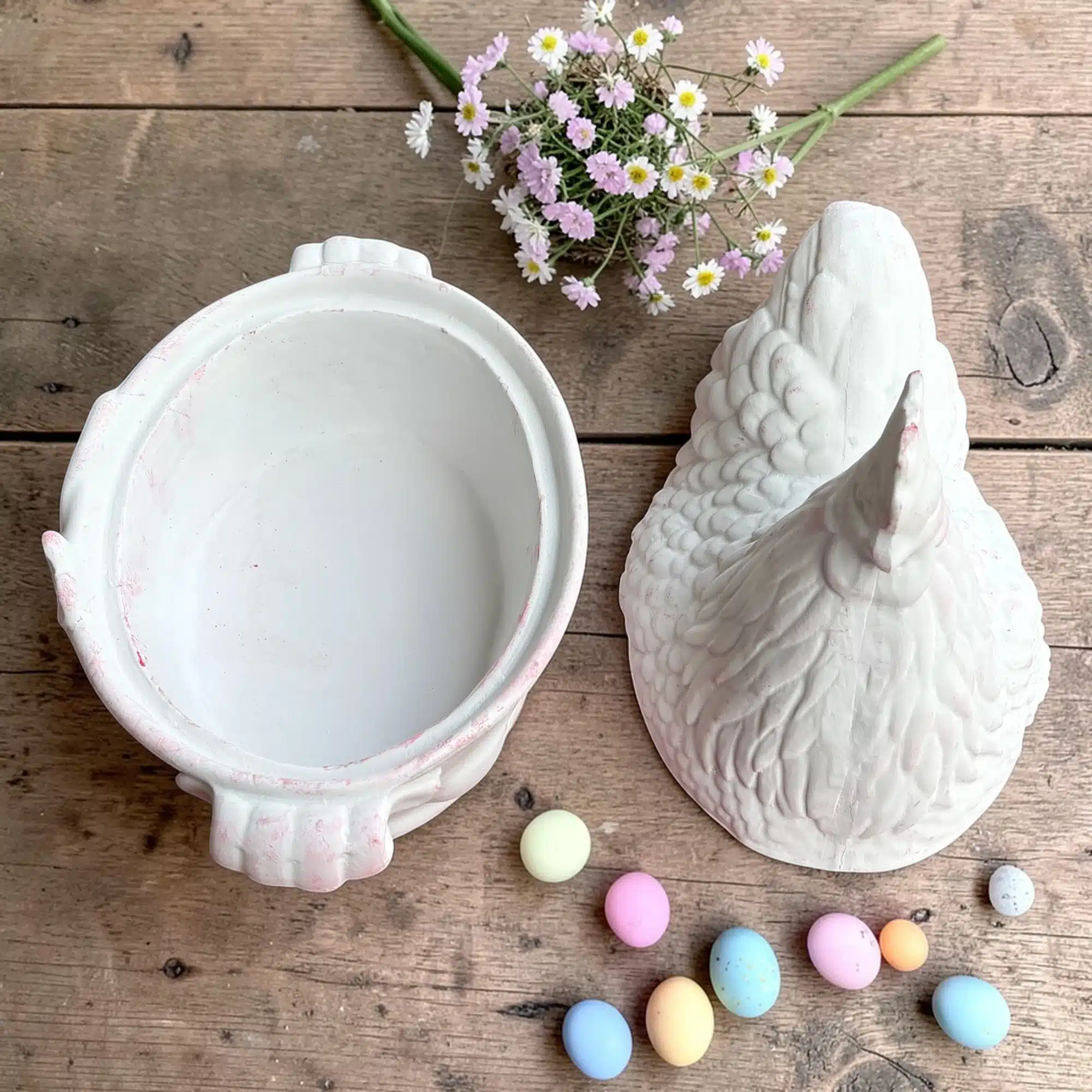 Hobi boyama sanatına yeni başlayanlardan kendi dekoratif objelerini üreten profesyonellere kadar herkes, bu pürüzsüz ve estetik tavuk figürlü kapaklı kase ile çalışmaktan büyük bir keyif alacaktır. Birinci sınıf yoğunlaştırılmış ham malzemeden en ileri kalıplama teknolojisiyle üretilen bu ürün, üzerinde hiçbir fabrikasyon kaplama veya cila barındırmaz. Bu doğal yapı sayesinde akrilik hobi boyalarını, eskitme pudralarını ve yaldızları kusursuz bir şekilde içine çeker. Ağır zımpara işlemleriyle vakit kaybetmeden doğrudan sanatsal üretime geçebileceğiniz bu tavuk figürlü kapaklı kase, el emeğinizin en kalıcı ve göz alıcı yansımalarından biri olacaktır.