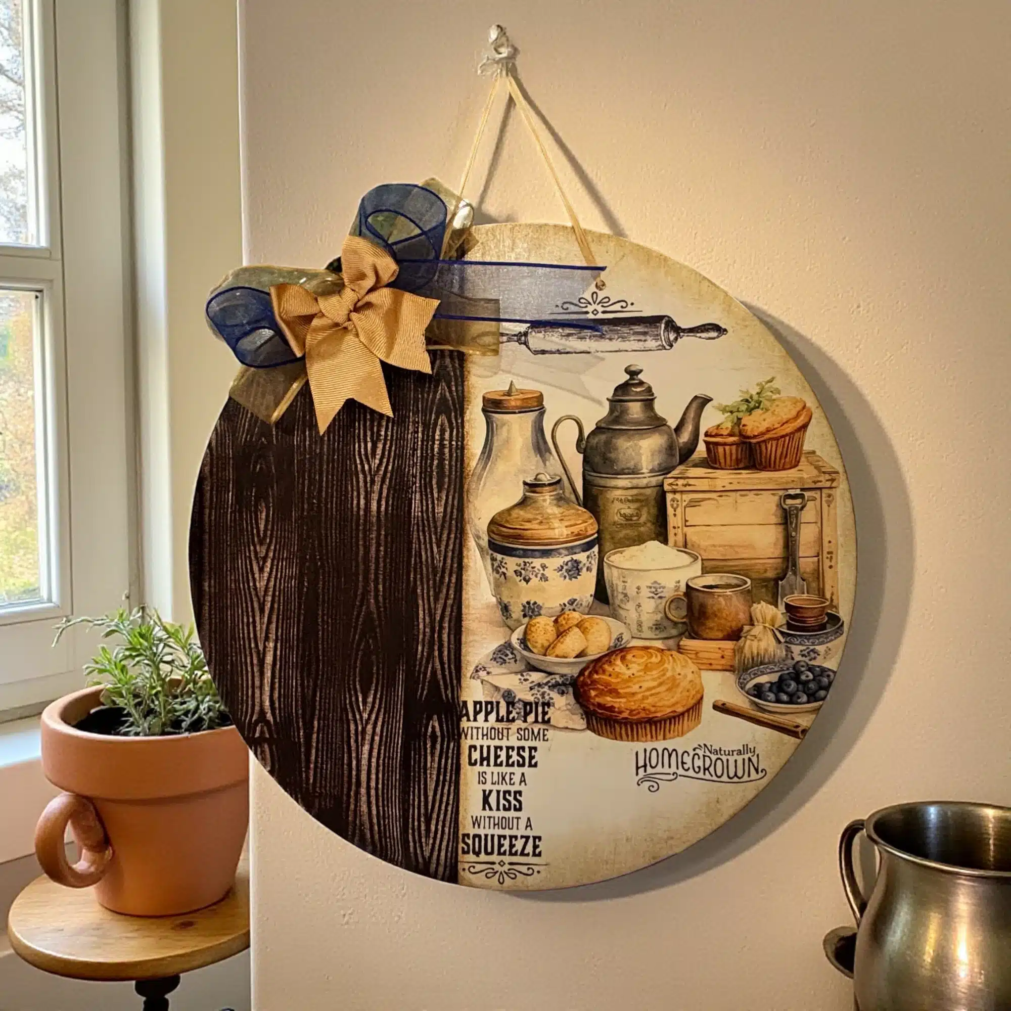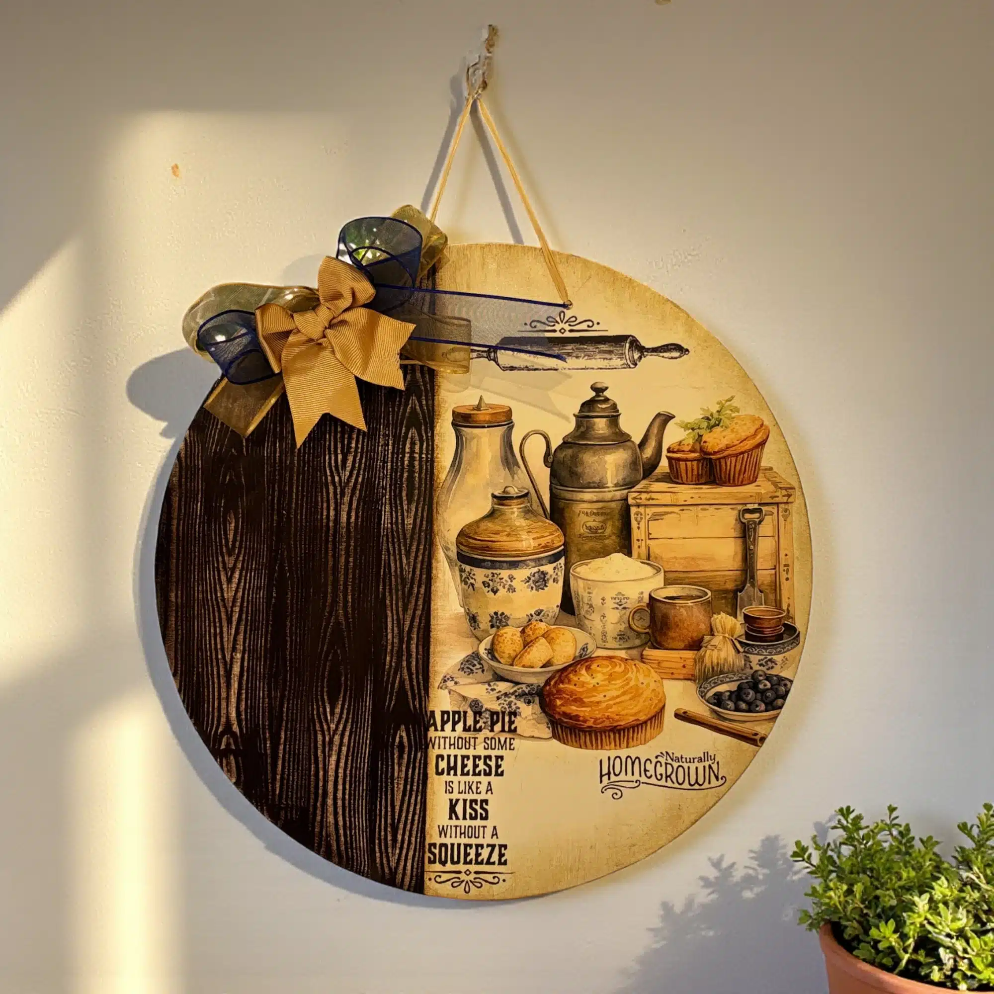 Vintage Mutfak Temalı Ahşap Duvar Panosu, evinizin kalbi olan mutfaklarınıza o çok sevilen “country” ve çiftlik evi (farmhouse) sıcaklığını taşımak için özenle tasarlandı. Günlük koşuşturmaca içinde mutfağınıza her girdiğinizde içinizi ısıtacak bu özel tasarım; elmalı turta, antika çaydanlık, seramik kavanozlar ve merdane gibi nostaljik detayları barındırıyor. Üzerindeki anlamlı İngilizce yazılar ve panonun yarısını kaplayan koyu ceviz rengi doğal ahşap dokusu, Vintage Mutfak Temalı Ahşap Duvar Panosu modelimizi sıradan bir dekorasyon objesi olmaktan çıkarıp, duvarlarınızın baş köşesine kurulacak bir sanat eserine dönüştürüyor.