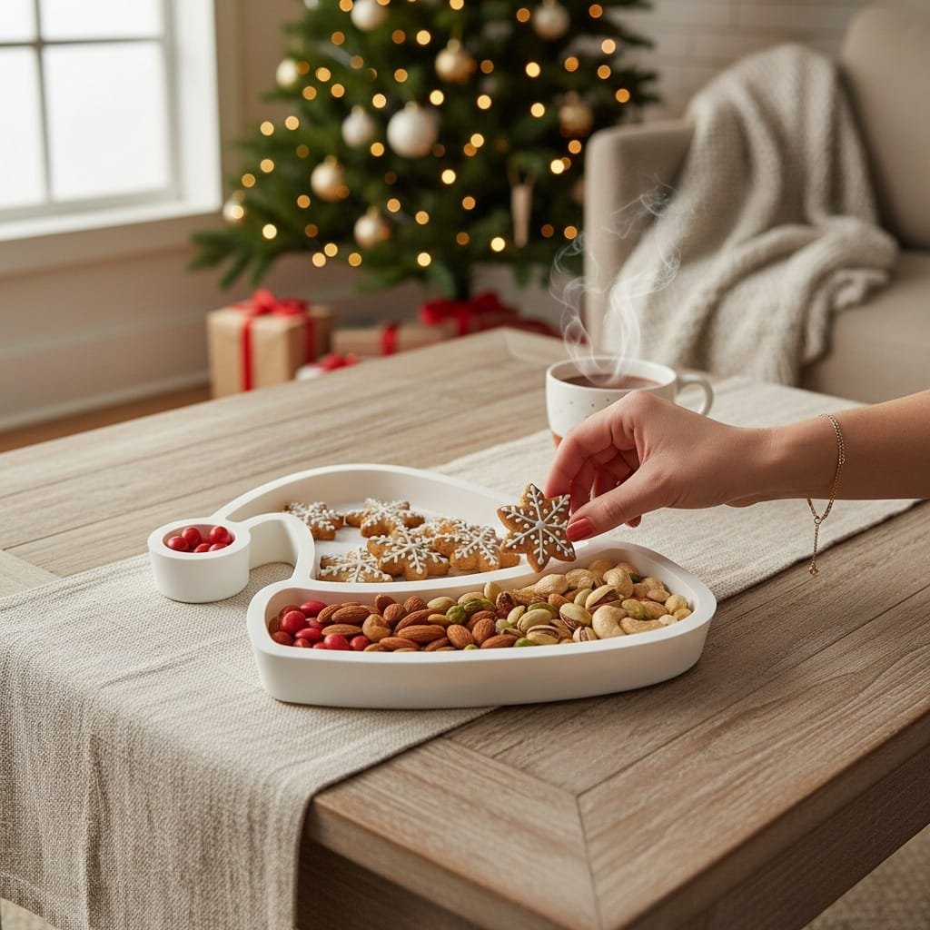 Dekorasyon Önerisi: Yılbaşı ağacınızın yanındaki sehpada, içine renkli drajeler ve zencefilli kurabiyeler koyarak sıcak bir karşılama sunumu hazırlayabilirsiniz. Ayrıca kırmızı ve yeşil peçetelerle kombinleyerek yılbaşı yemek masanızda kişiye özel servis tabağı olarak da harika bir etki yaratacaktır.
